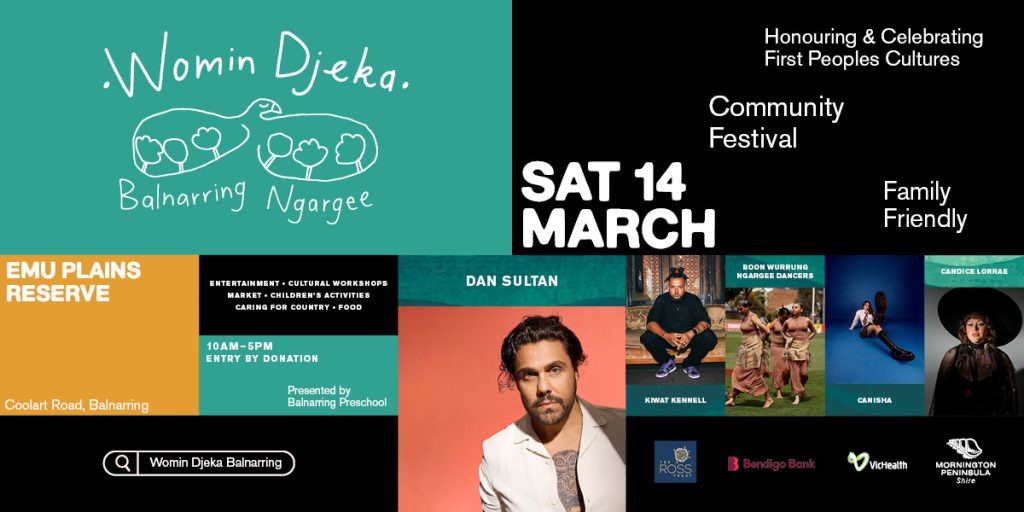 Presented by Balnarring Preschool, with guidance from Boon Wurrung Elder Professor N’arwee’t Carolyn Briggs OAM, each year the festival evolves with new learning opportunities to engage all members of the community. This is a family friendly event where there is lots for everyone to do and experience. This year we are excited to welcome the sensational Dan Sultan as the headline act alongside other outstanding First Nations Artists Candice Lorrae, Canisha and Kiwat Kennell.