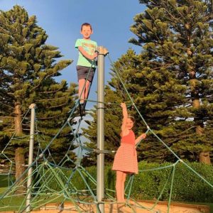 The area around Lake Pertobe it beautiful and we caught the evening glow reflecting off the lake. After watching a swan wreak havoc and break up what looked to be a lovely dinner picnic, we headed toward the first playground area.